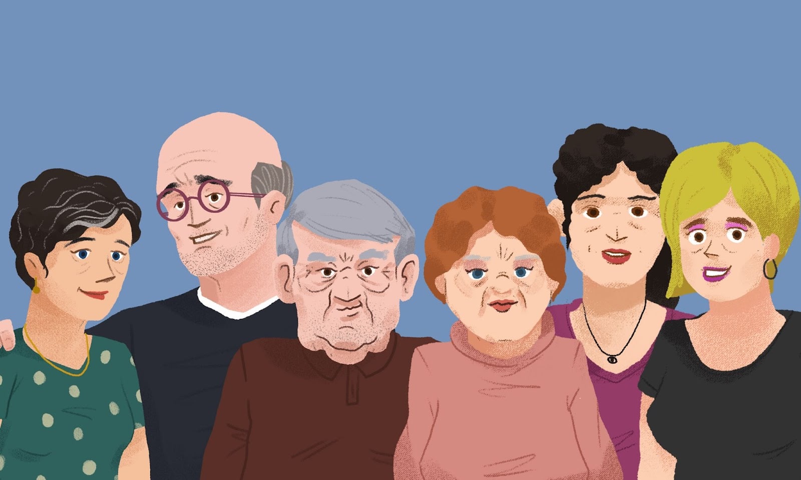 In the pictures below, we see Petra Bogdan (Mario’s sister), once with her parents and then again with her own family. She is labeled with the letter [b] in both pictures. Read the sentences below aloud and fill in the letter of the person to whom the sentence refers and the letter of the speaker. The first one has been done for you as an example.