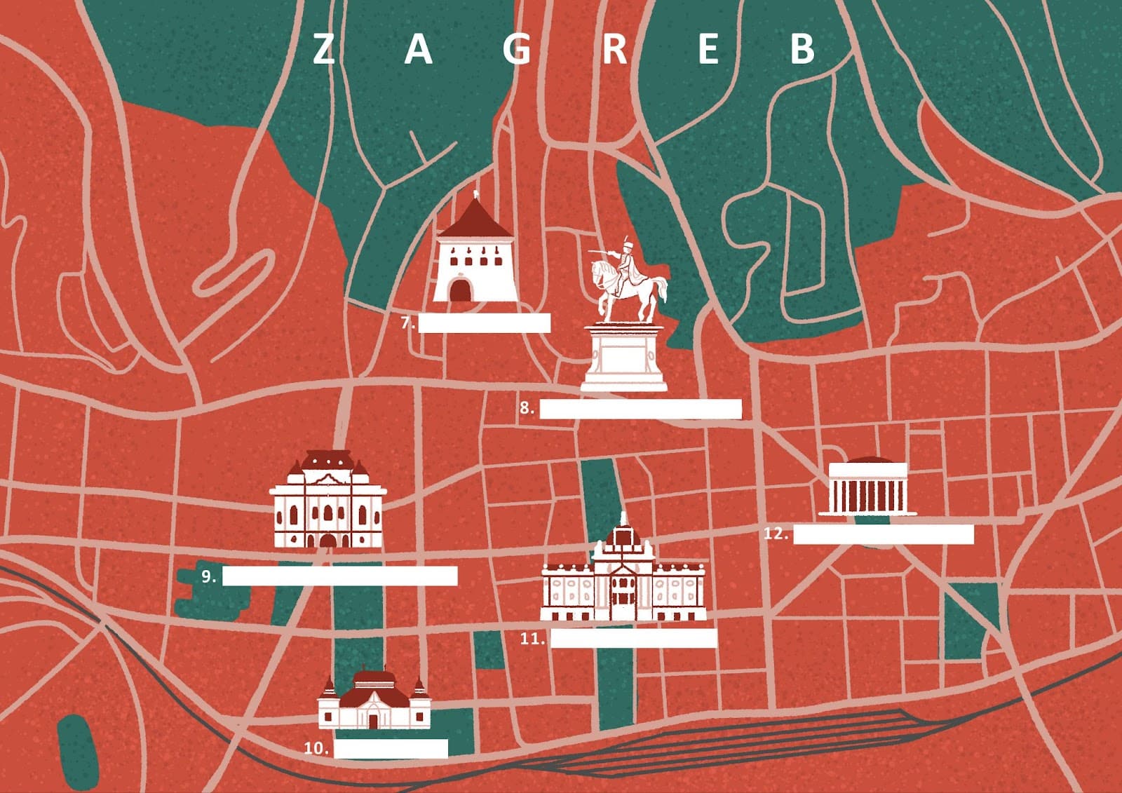 👥 Rad u paru [Pair-work]. Handout. Each of you will receive a map of Zagreb. Talk with your classmate and complete the picture you were given by asking each other for the missing information. Place these items / locations of interest on the map where they belong. Pay attention to the given images on the map. Write down the name of the location as well (for example: park Zrinjevac).