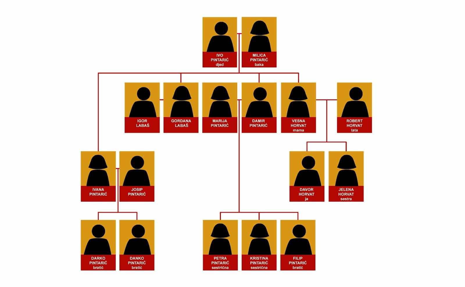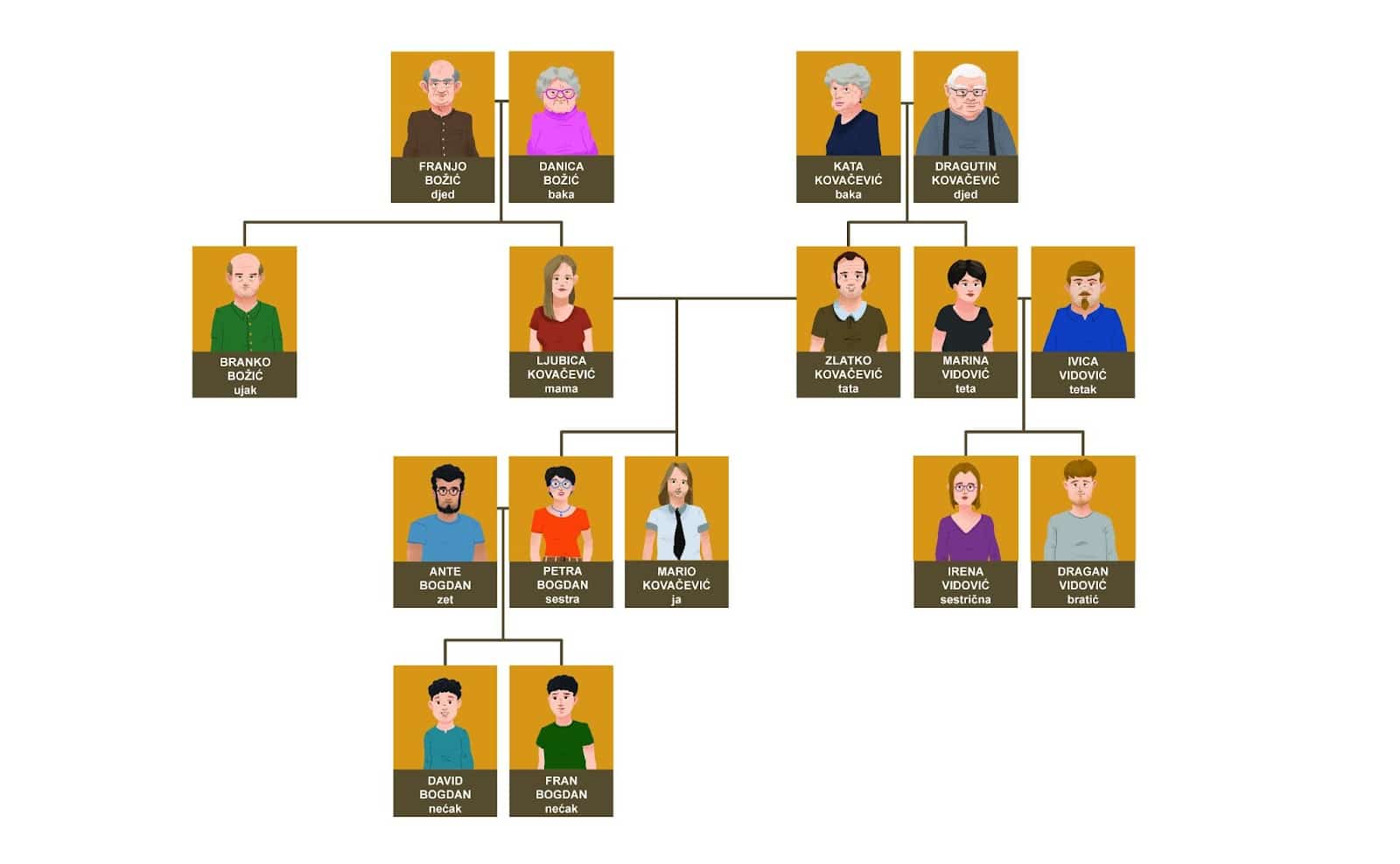 Complete the sentences by using the appropriate form of the possessive adjective (example: Laurina mama). Read the sentences carefully. At times more than one answer is possible. If that is the case, choose only one answer. The first sentence will reveal the gender of the person. In the second sentence, based on the information you have, you will need to write the name of the person in their possessive adjective form. Look at the picture of Laura's family and complete the task. For example: To je njezina sestra. Laurina sestra se zove Emily.