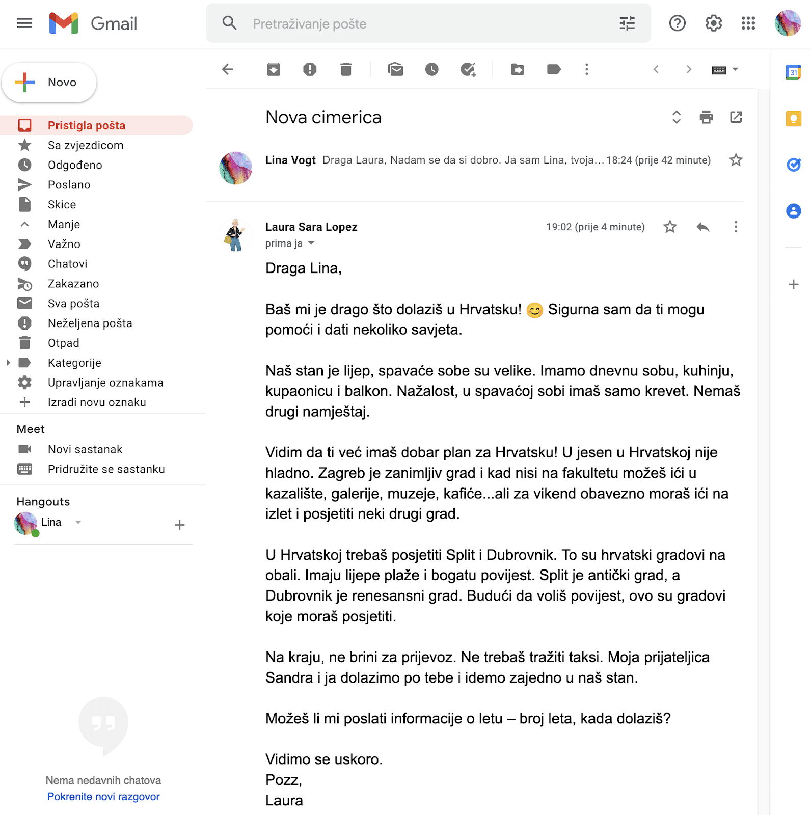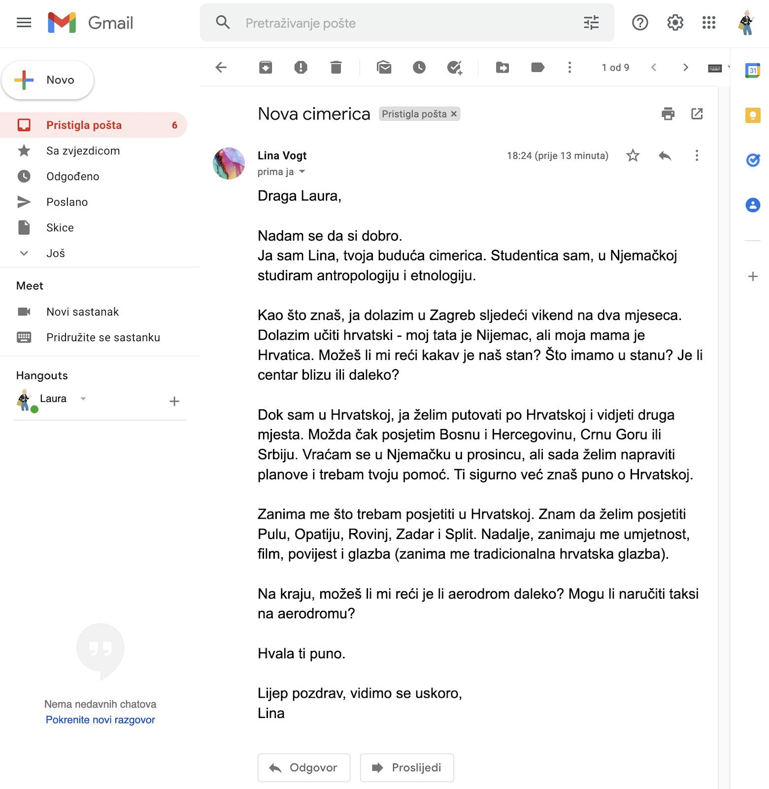 Lina is coming to Croatia to study Croatian. She is making plans for her travels and she wants to gather more information from her new roommate. She decides to send an email to Laure and ask some general questions. Read the text and answer the questions. Talk with your classmate to check your answers.