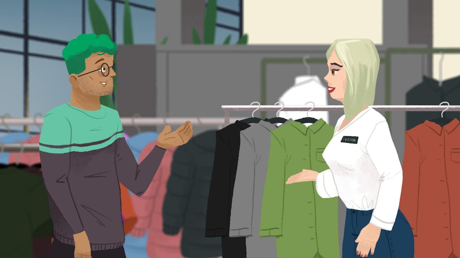 Prodavačica | Naravno. Imamo veliki izbor. Evo, ovdje se nalaze svi modeli. Želite li možda sportski stil, poslovni ili ležerni stil? |